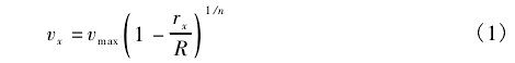 其中,vx一距離管道中心線rx的流速,m/s;Umax管道中心線的流速,m/s;r,--流速測(cè)點(diǎn)與管道中心線的距離,m;R一管道內(nèi)半徑,m;n一隨雷諾數(shù)不同而變化的指數(shù)。